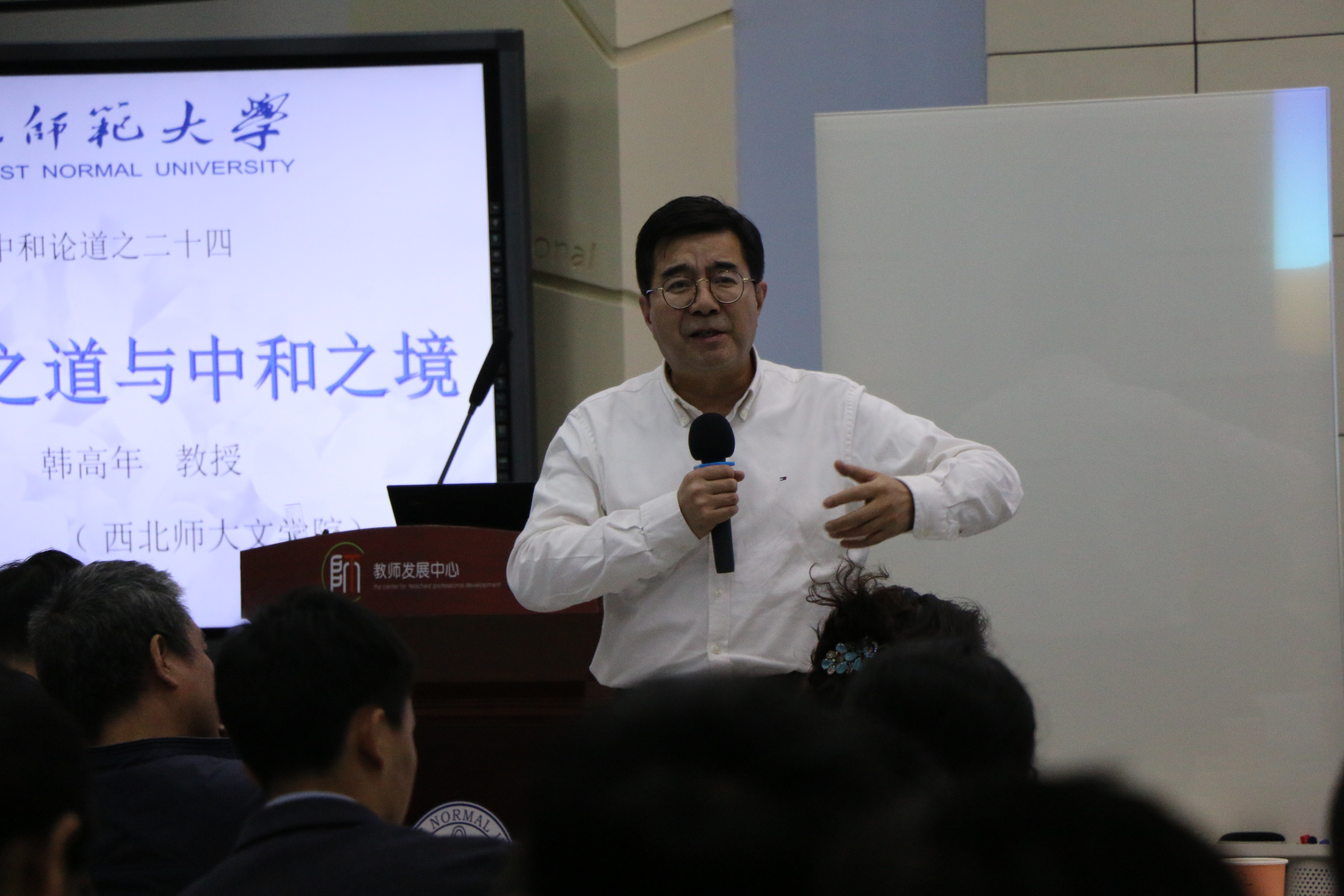 韩高年教授分别讲述了子思、孟子、冯友兰及庞朴对“中庸”与“中和”思想的发展。子思《中庸》的贡献是从人的心理结构和世界观的角度论“和”。孟子论“中”的思想是“经权相齐”。朱熹的贡献为《四书集注·中庸集注》中对中庸思想的理论阐发,并产生了丙戌之悟:以“未发”时的内心体验的探索,对中庸的实践性突破,这个突破中他吸收了道家的“坐忘”、“心斋”之法及佛家的“静坐”、“顿悟”。冯友兰的贡献是提出了“阐旧邦以辅新命”的思想,并且冯友兰澄清了对中庸的种种误解,如中庸不是折中主义,也指出了中庸有道德和功利两个层面,且中庸是动态的。庞朴论中庸:中庸所谓中,就是第三者,承认二分又承认中庸,也就在事实上承认了一分为三,“中”并不是居间环节或过渡阶段。