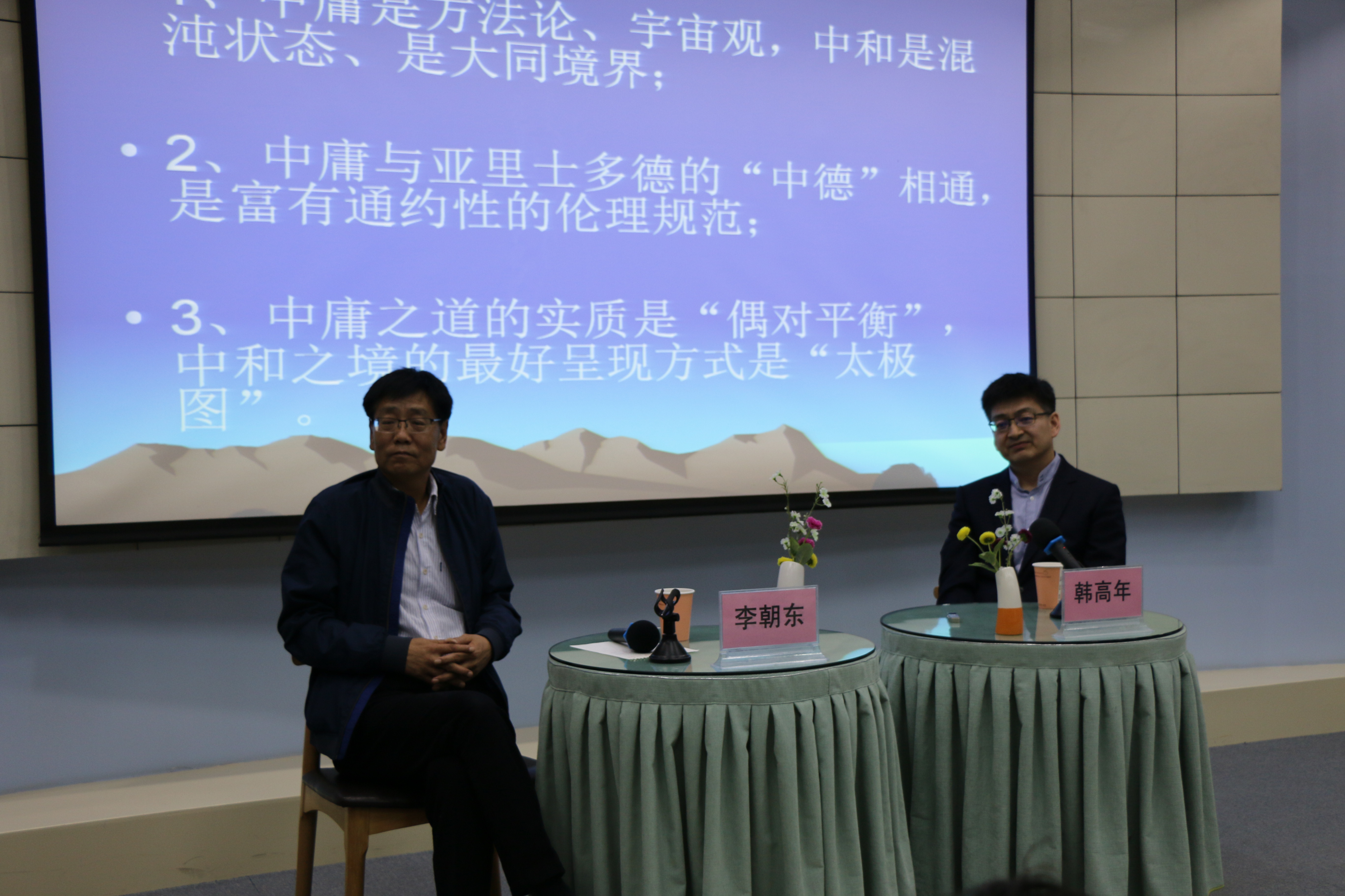讲座结尾部分,韩高年教授做了小结:第一,中庸是方法论、宇宙观,中和是混沌状态,是大同境界。第二,中庸与亚里士多德的“中德”相通,是富有通约性的伦理规范。第三,中庸之道的实质是“偶对平衡”,中和之境的最好呈现方式是“太极图”。