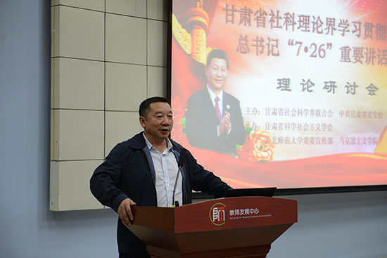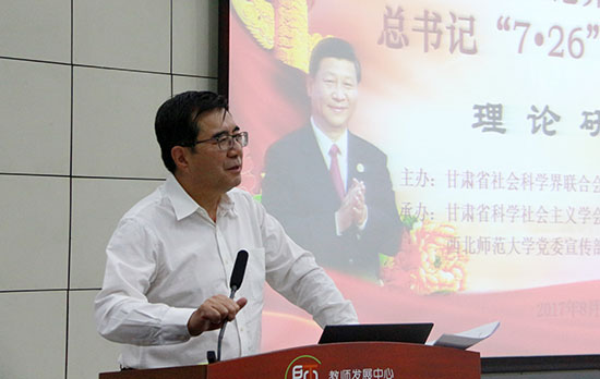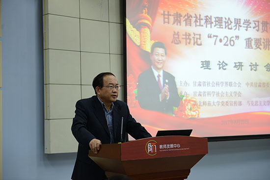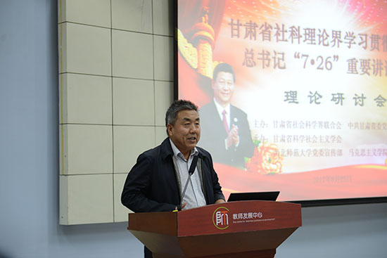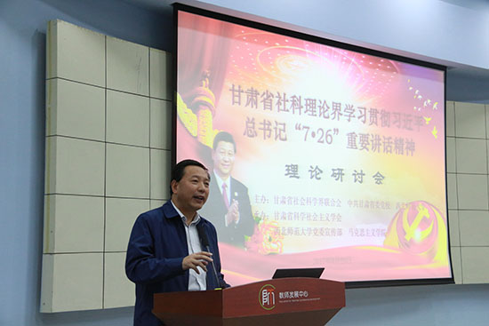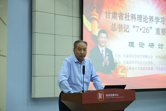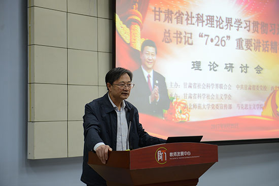 甘肃省社科联党组书记、常务副主任冯湖教授在致辞中指出,习近平总书记“7·26”重要讲话是马克思主义中国化最新成果,开辟了当代中国马克思主义发展新境界,全省社科界都要深入学习和贯彻好讲话精神。要充分认识讲话的重要意义,深刻领会讲话的丰富内涵,以习近平总书记系列重要讲话精神和治国理政新理念新思想新战略为科学指引和根本遵循,立足中国特色社会主义发展的新阶段,牢牢把握我国发展的阶段性特征,深化理论研究,加强组织领导,增强宣传力度,自觉在理论上拓展新视野。