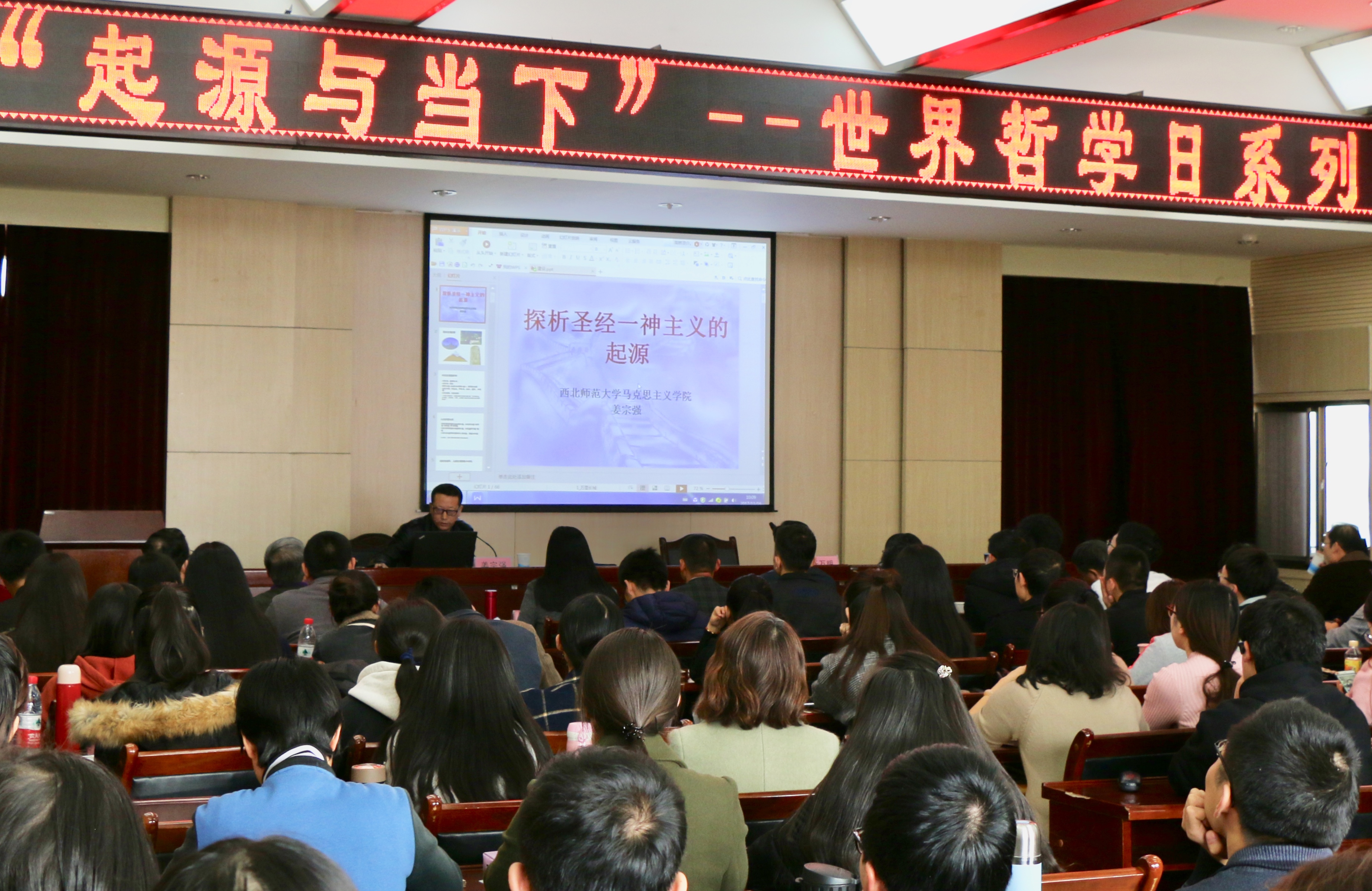 2017年11月10日,由新葡萄8883官网AMG哲学系主办的“世界哲学日系列讲座”在新葡萄8883官网AMG4楼学术报告厅举行,本次的主题为“起源与当下”,分上下午总共进行了四场报告,先后由新葡萄8883官网AMG姜宗强副院长、贺更粹副教授(上午场);朱海斌博士和哲学系主任贾克防副教授(下午场)主讲。上午场由任万明副教授主持,下午场由师庭雄副教授主持。甘肃省委党校岳海湧教授、新葡萄8883官网AMG传媒学院杨光祖教授、新葡萄8883官网AMG王金元教授、周红教授、吴琼副教授以及各位教师、学生爱好者共百余人参加活动。