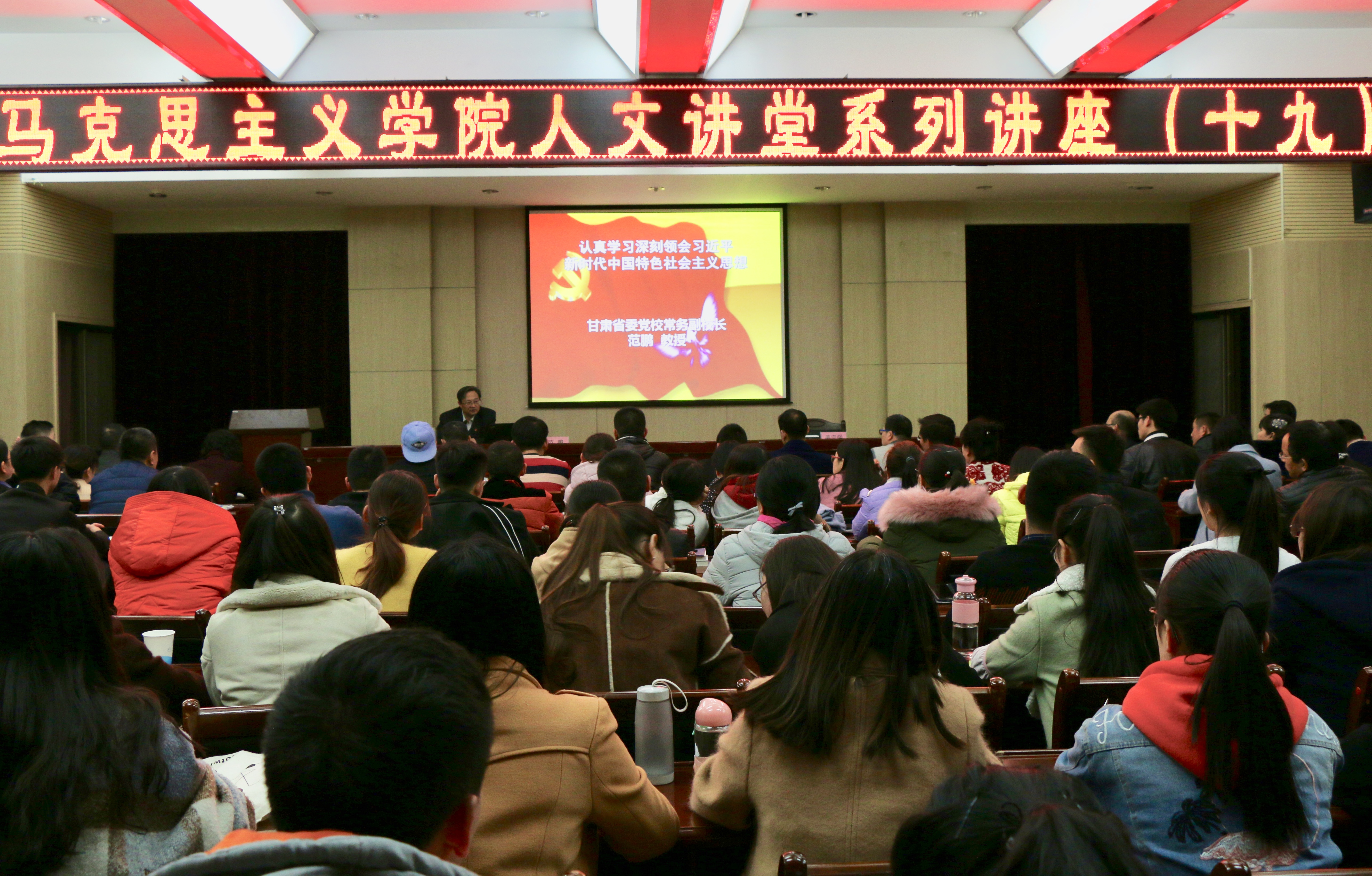 2017年11月22日晚7:30,新葡萄8883官网AMG人文讲堂第十九期暨研究生学术月专家论坛活动在新葡萄8883官网AMG四楼学术报告厅举行。甘肃省委党校常务副校长范鹏教授作《认真学习深刻领会习近平新时代中国特色社会主义思想》主题报告,报告会由学院副院长姜宗强副教授主持,马院教师、本硕博学生两百余人参加活动。