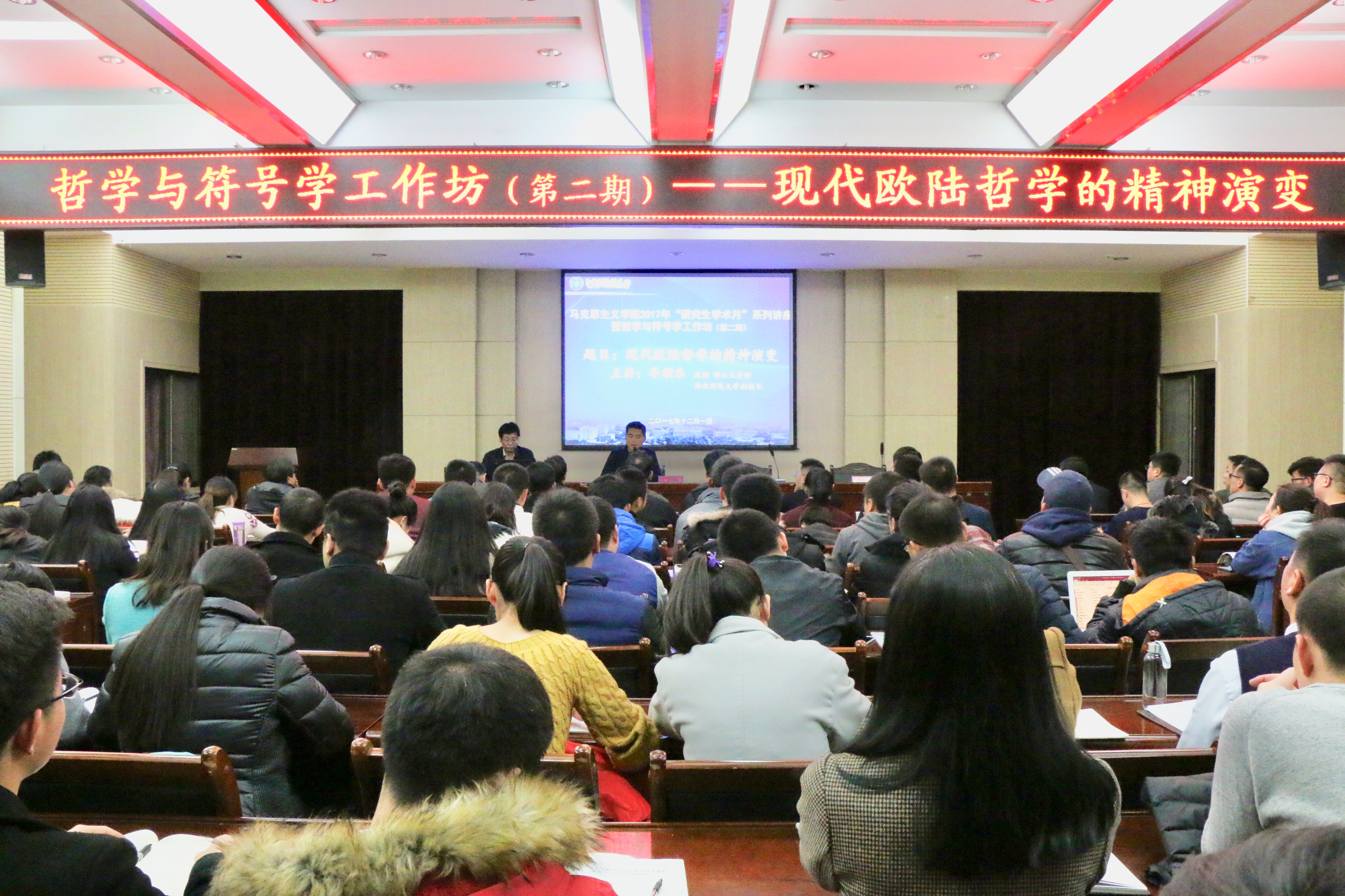 2017年12月1日晚,由新葡萄8883官网AMG哲学系与外国语学院符号学研究中心共同联合主办的“哲学与符号学工作坊”第二期在新葡萄8883官网AMG四楼报告厅举行。新葡萄8883官网AMG副校长李朝东教授作“现代欧陆哲学的精神演变”学术报告,哲学系主任贾克防副教授主持,哲学系副教授师庭雄、外国语学院副教授蒋世强进行评议。研究生院熊华军副院长、新葡萄8883官网AMG姜宗强副院长以及其他来自西北师大和安宁区各高校的教师、学生等,共百余人参加了讲座。