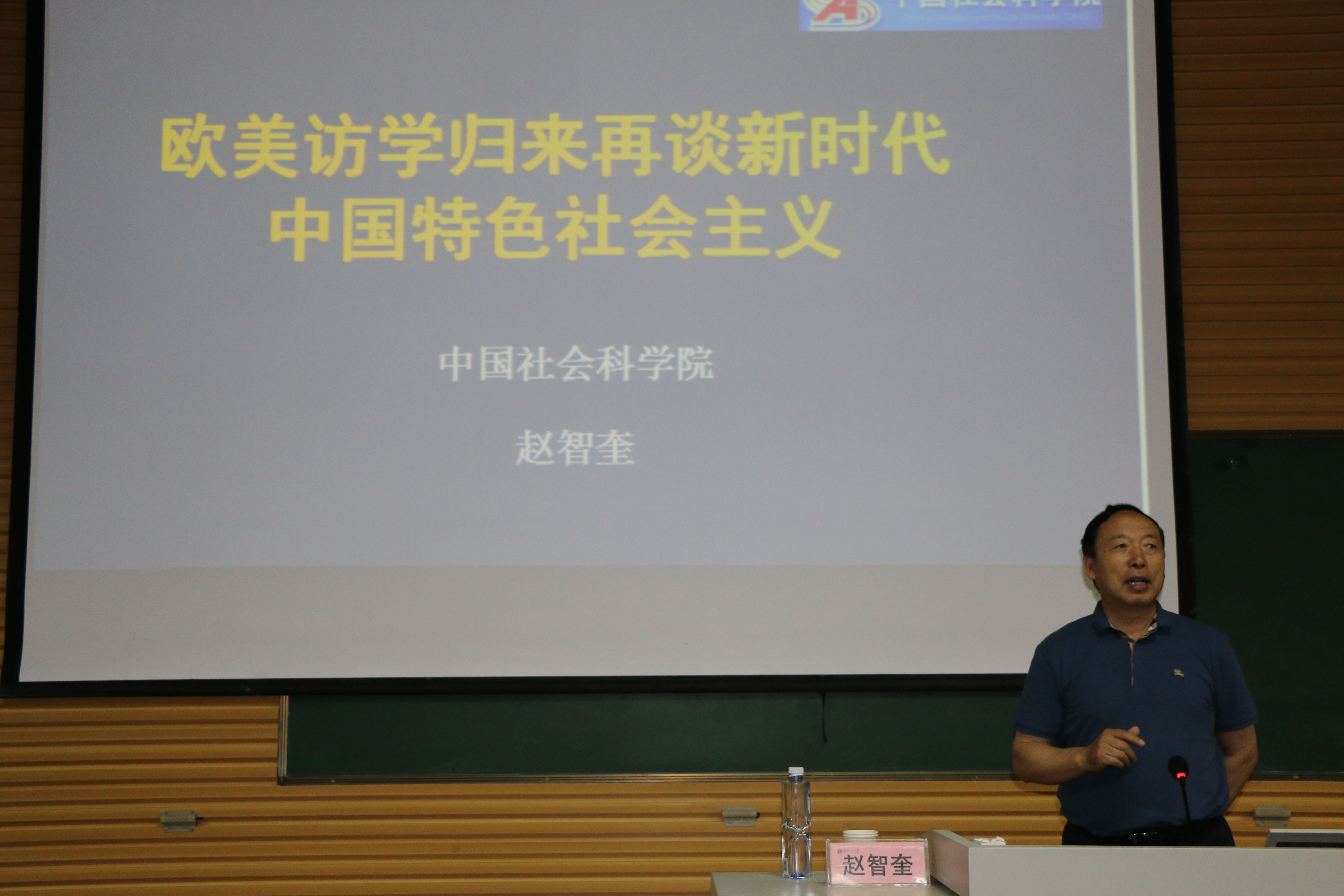 6月13日下午,新葡萄8883官网AMG“习近平新时代中国特色社会主义思想大讲堂”第四讲在学校新校区学术报告一厅举行。中国社会科学院研究员、博士生导师赵智奎教授应邀作题为“欧美访学归来谈中国特色社会主义”的讲座。讲座由新葡萄8883官网AMG金建萍教授主持,新葡萄8883官网AMG本科生、研究生共一百余人聆听了此次讲座。