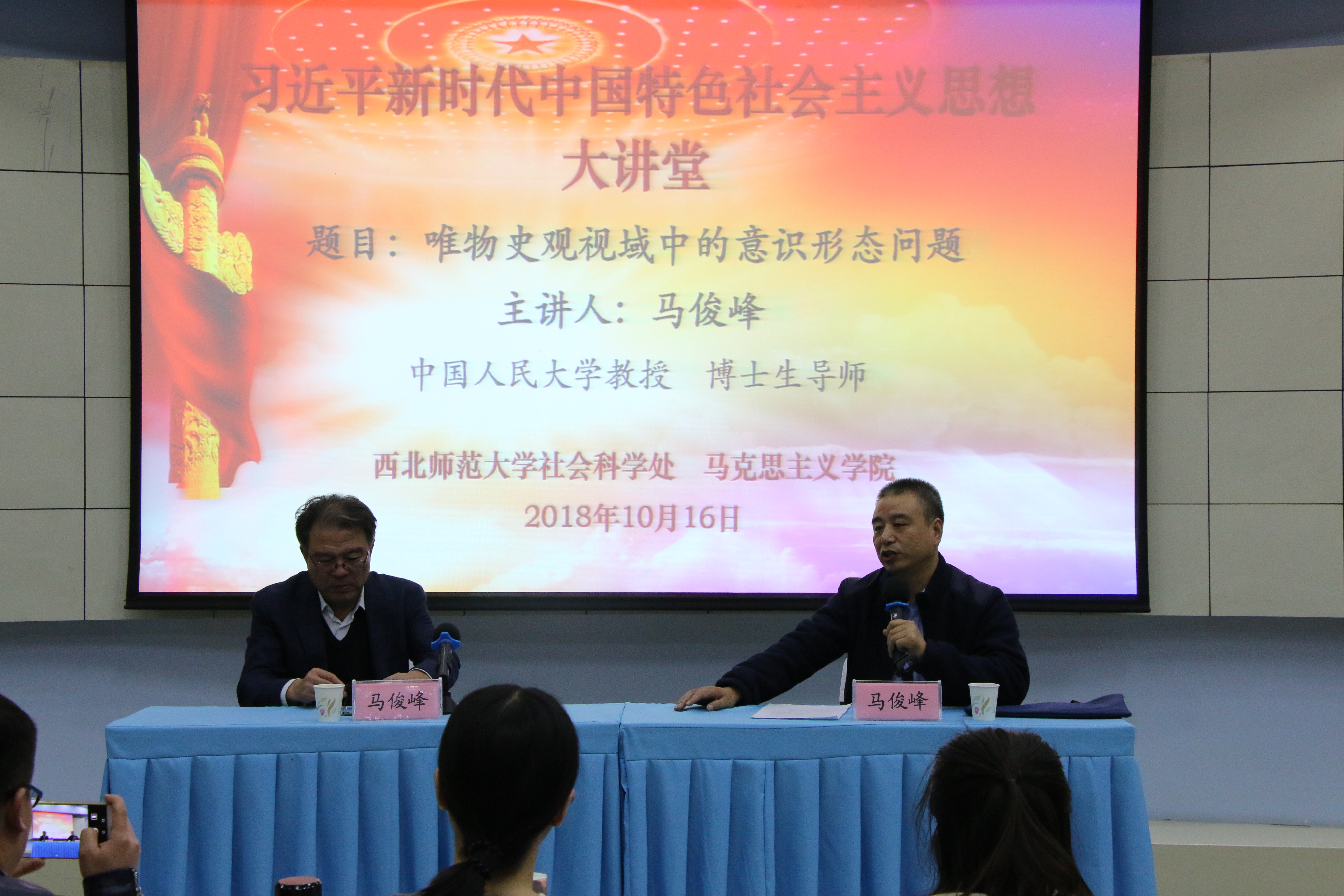 2018年10月16日下午3点,新葡萄8883官网AMG“习近平新时代中国特色社会主义思想大讲堂”第五讲在教师发展中心二楼会议厅举行。中国人民大学教授、博士生导师马俊峰教授应邀作了题为“唯物史观视域中的意识形态问题”的讲座, 讲座由新葡萄8883官网AMG副院长马俊峰教授主持,新葡萄官网博、硕研究生100余人参加了本次活动。