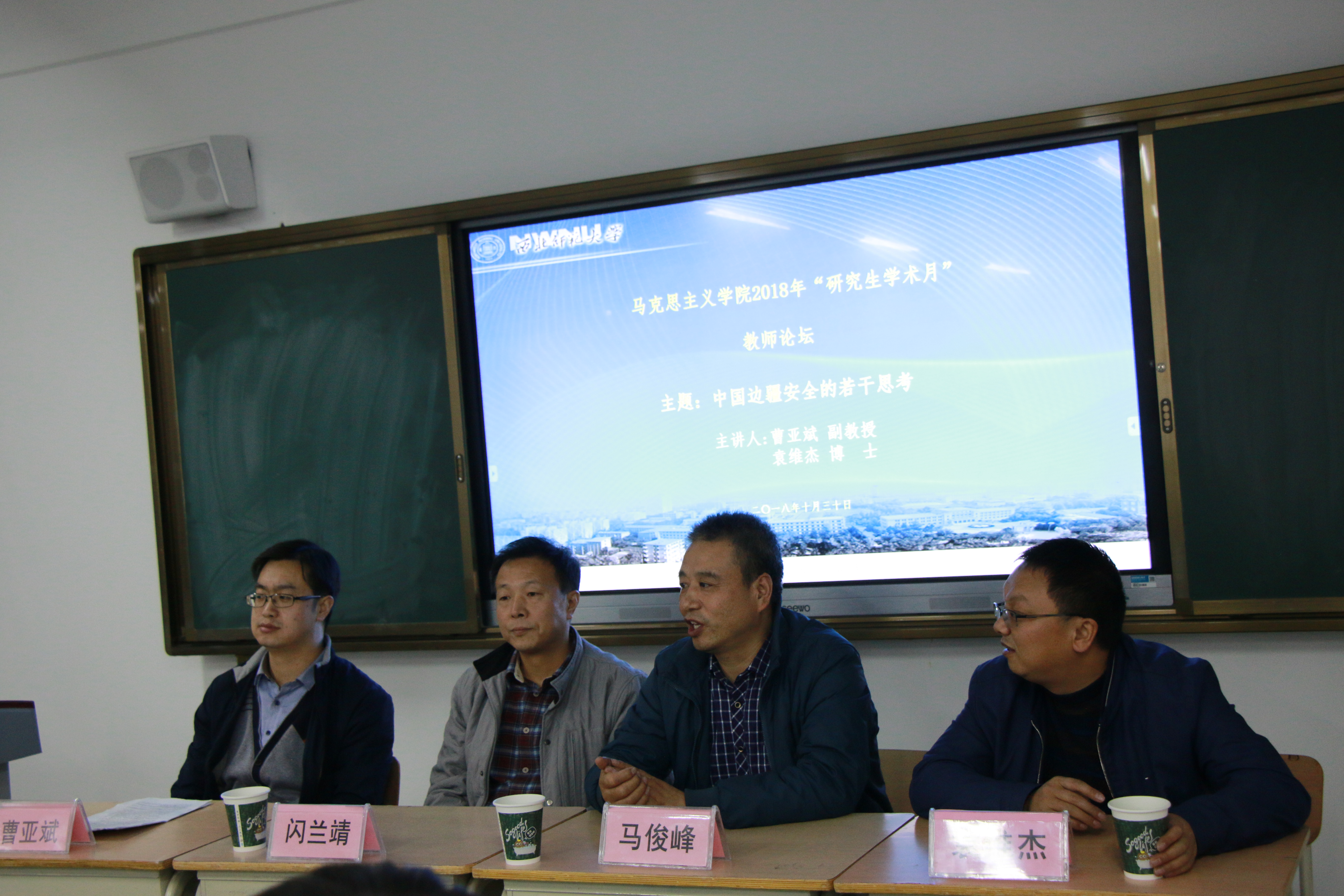 在答疑互动环节,老师和学生就各民族区别对待传统文化和人类命运共同体等问题展开了激烈的讨论。马俊峰副院长从马克思主义角度出发提出了“公民身份”、“疆域划分的目的”等四个建设性问题,闪兰靖副教授和曹亚斌副教授从不同的角度为大家解答了疑惑。马峻峰副院长结合讲座内容,提倡大学生从实际问题入手并学会独立思考,在追梦路上书写华丽篇章。