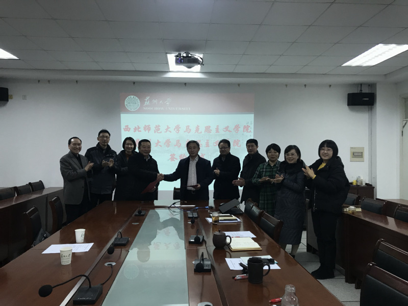 1月3日,学院一行3人赶赴苏州,与苏州大学新葡萄8883官网AMG院长田芝健教授、张才君书记、副院长许冠亭教授等全体班子成员一道,对前期的合作意向经再次协商并达成一致后,正式签署了合作协议。协议内容主要包括互聘师资、互认课程、共同培养博士硕士研究生、协同创新高校思想政治理论课教学、联合申报课题、联合开发红色文化资源等。