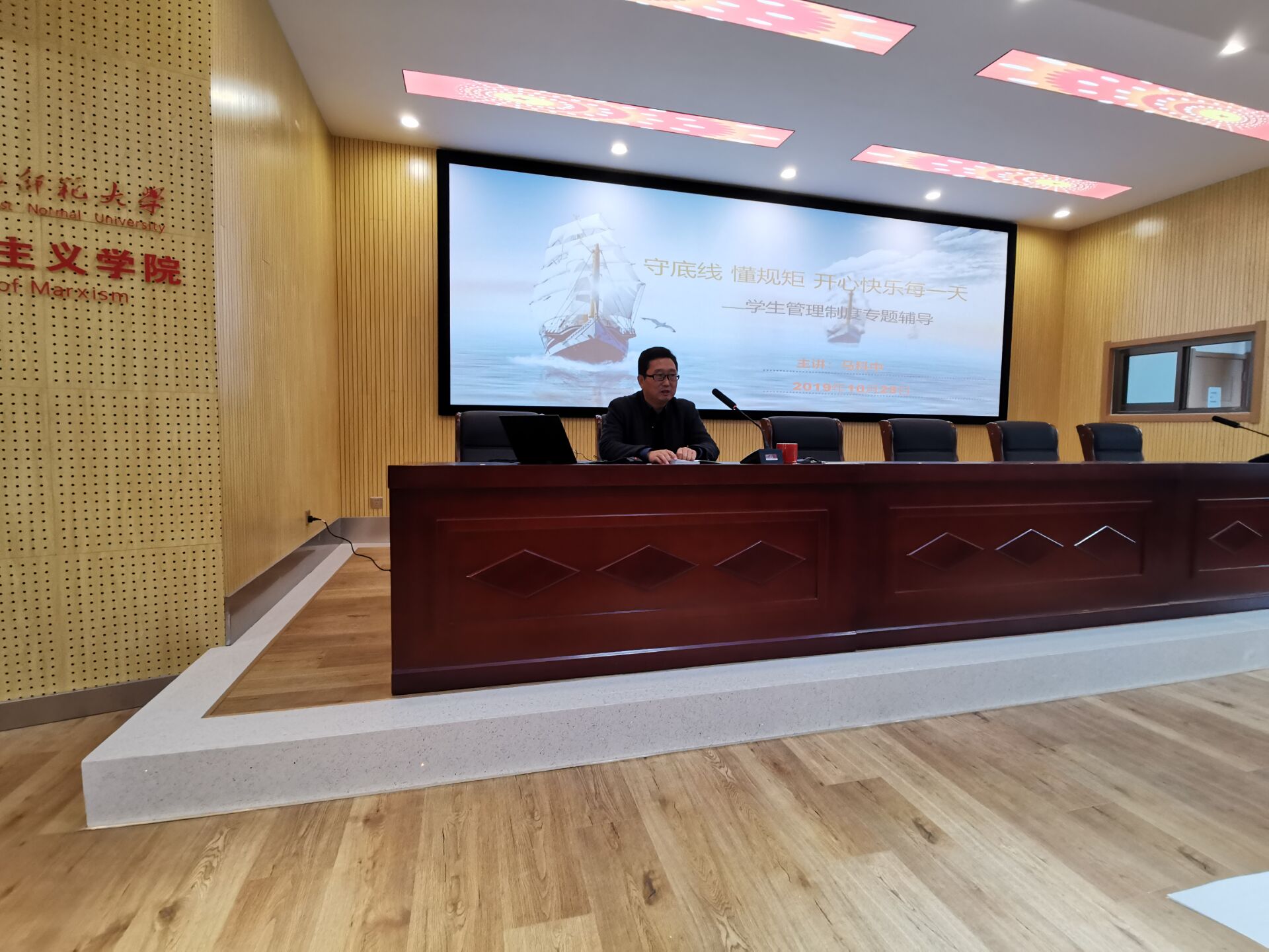 2019年10月25日新葡萄8883官网AMG在田家炳教育书院六楼报告厅举行题为“守底线,懂规矩,开心快乐每一天”学生遵纪守法教育专题讲座,由学院党委副书记马科中主讲。