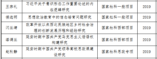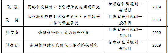 截至2019年11月,新葡萄官网教师获批国家社会科学基金项目5项,教育部人文社科项目2项,甘肃省社科规划项目4项,具体信息如下:
