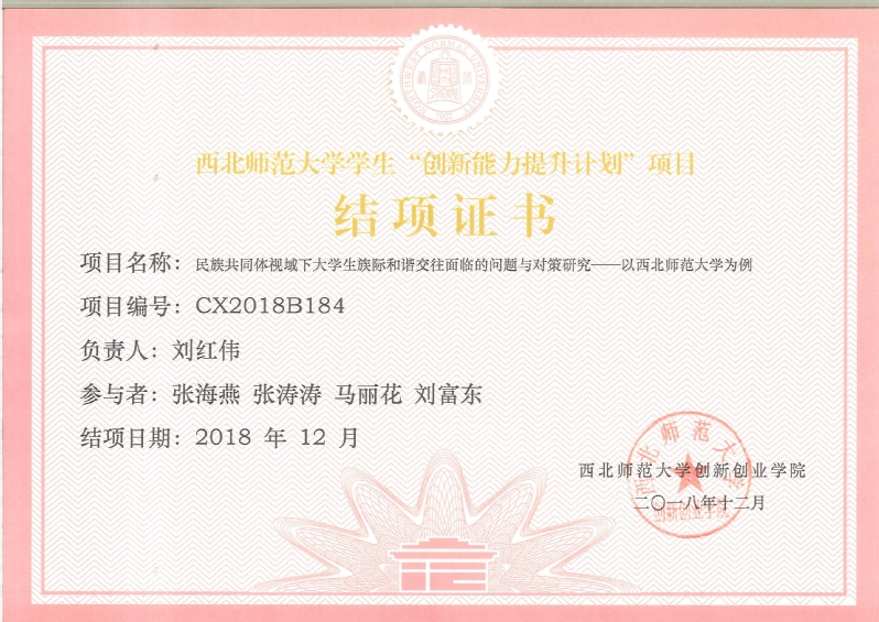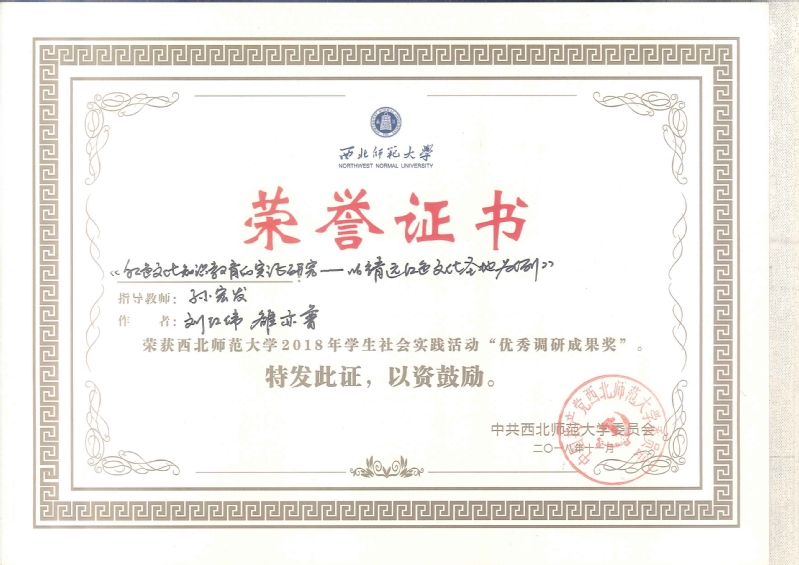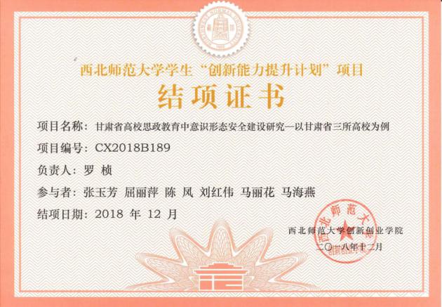2019年主要主持的《红色基因与红色文化知识教育的实证研究-以靖远红色基因圣地为例》项目研究论文在甘肃省教育厅举办的“红色基因传承行动”中获得三等奖