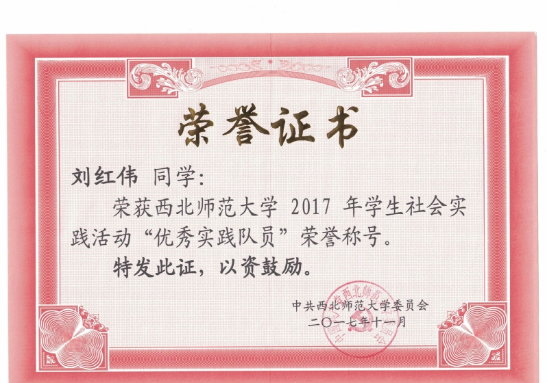 刘红伟在大学三年中利用寒暑假以及其他节假日时间,积极参与社会实践活动与志愿服务活动,在学院袁维杰老师的带领下,不断走进、观察社会,力求在社会实践过程中不断提升和锻炼自己,可以说,这是他大学生活的另外一个非常重要的组成部分,他参加的主要活动有: