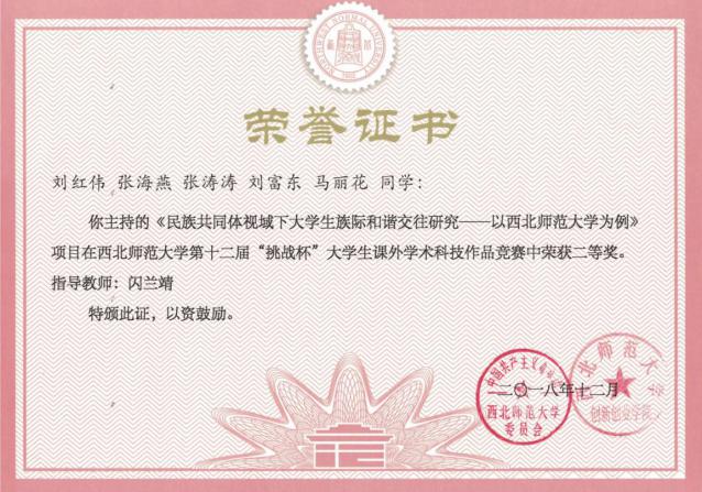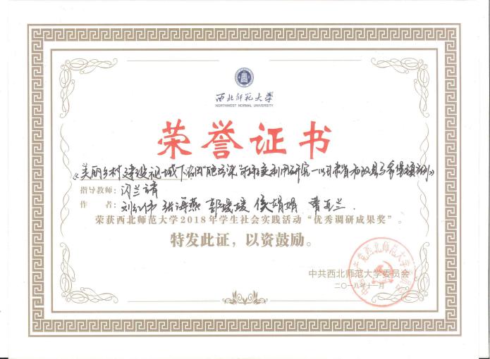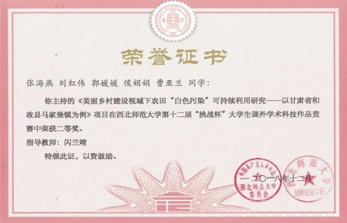 1.《乡村农田“白色污染”回收与可持续利用研究—以甘肃省和政县马家堡镇为例》项目入选2018年“青年中国行”暑期社会调研实践活动“全国百强团队”荣誉称号;