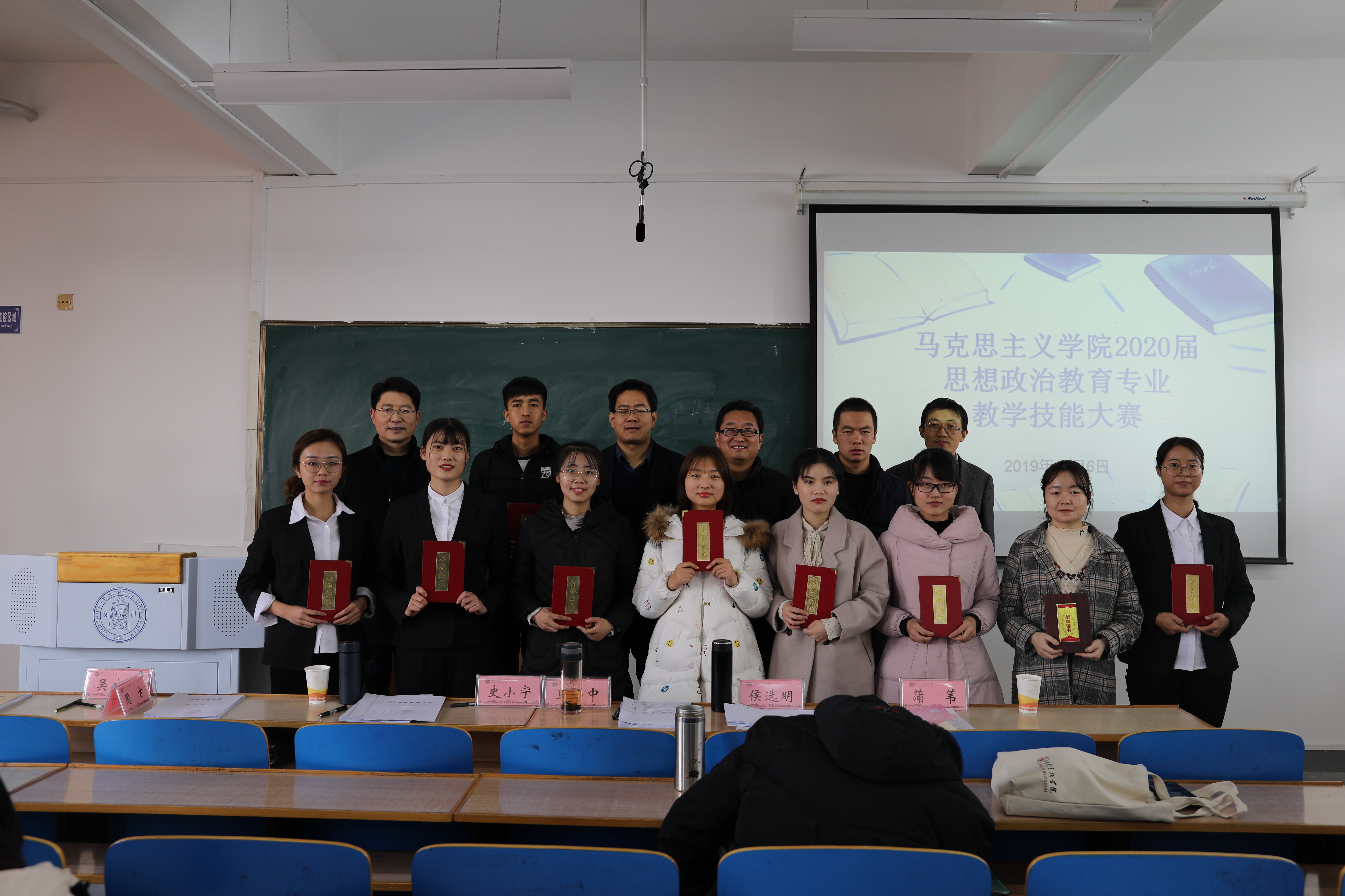 模拟授课结束后评委老师进行了精彩点评,指出要提升师范生培养质量,督促大家提高板书质量、望大家以锐意创新的思想、竞争开拓的胆略、严谨科学的态度、诲人不倦的品格为教育事业的发展贡献自己的力量,更指出做好老师要关注心灵的体验、哲学的思考、文学的表达、历史的底蕴、技能的养成、艺术的表演、与广泛的实践。最终严盼盼、代君等10位同学分别获得学院初赛一、二、三等奖,评委老师为选手颁奖并合影留念。