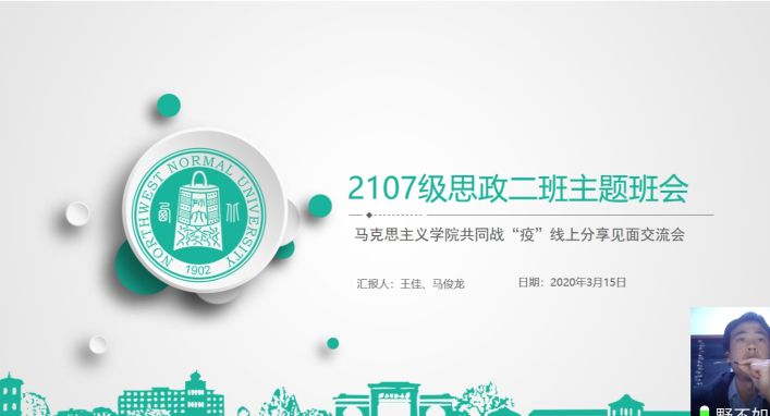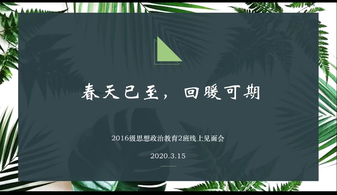2018级思想政治教育(1)班在正式开始线上见面交流会之前有同学点歌说:“我们放校歌吧,我真的好想念学校啊。”“什么时候可以返校”成为了每个同学们心中最挂念的问题。郭琦老师向各位同学解答了不能返校的原因以及学校的相关政策,嘱咐同学们安心在家上网课,未见召绝不回,并表示一定会提前通知同学们具体的返校时间,给大家吃了一颗定心丸。同时,老师们也询问了同学们的家里情况、上网课的情况,并对同学们的疑问一一解答,对同学们所反映的问题一一记录并提出解决方案,叮嘱同学们在家也要保护好自己,按时完成每日的疫情填报工作。