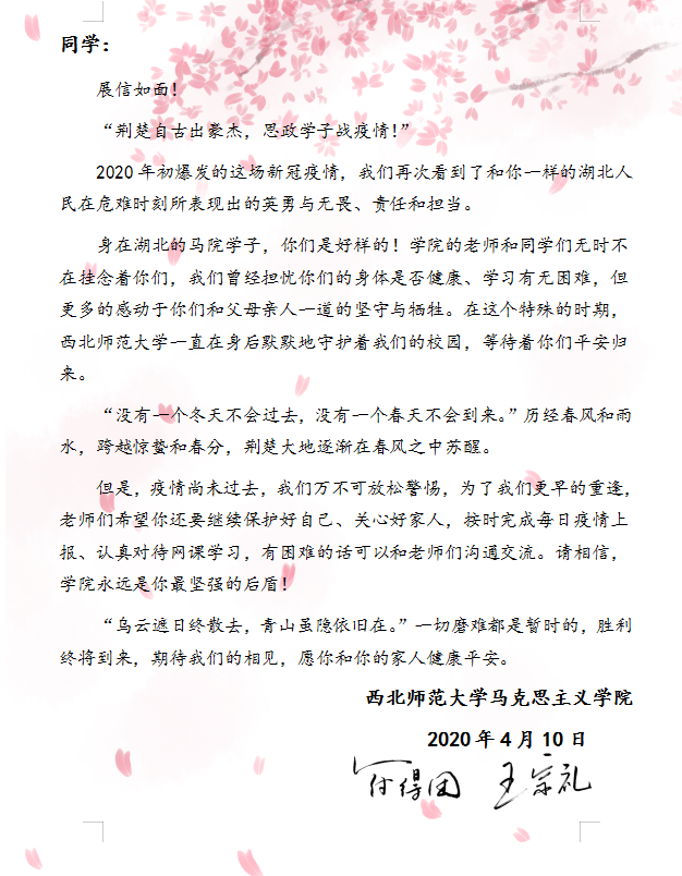 荆楚自古出豪杰,思政学子战疫情”,礼轻情重,纸短情长,新葡萄8883官网AMG始终牵挂着身处湖北的思政学子,感动于他们的坚守与担当,也时刻关心着他们的居家学习情况,为他们送去全院师生的关怀与祝福。
