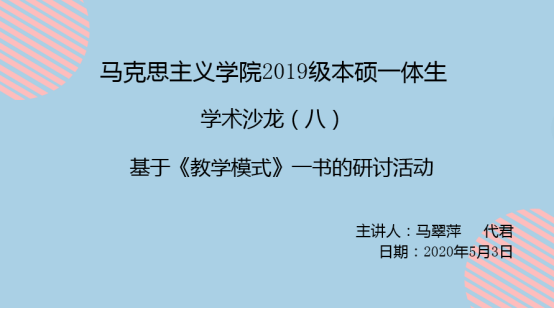 为贯彻落实“停课不停学,停课不停研”的原则, 2020年5月3日下午2点,新葡萄8883官网AMG2019级本硕一体生通过腾讯会议平台开展了本学期第八次学术沙龙活动。本次活动由2019级本硕一体生马翠萍和代君两位同学主持。