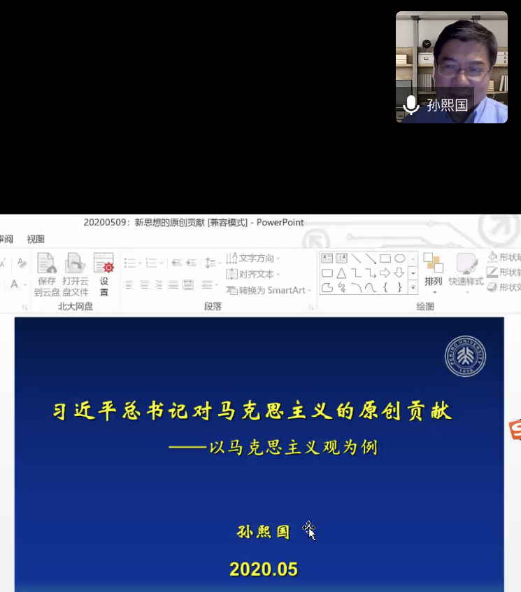 应新葡萄8883官网AMG邀请,北京大学孙熙国教授在线作了题为《习近平总书记对马克思主义的原创性贡献》的学术报告。报告由新葡萄8883官网AMG副院长马俊峰教授主持,学院教师、本硕博学生共计200余人在线聆听了报告。