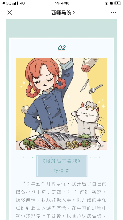 “今年五个月的寒假,我开启了自己的做饭小能手进阶之路。为了‘讨好’老妈,挽救亲情,我从做饭入手。刚开始的手忙脚乱到后面的游刃有余,在学习的过程中我也逐渐爱上了做饭。以前总讨厌做饭,可真正接触之后,才发现它的乐趣所在。同一个食材,有不同的做法,有不同的味道。在不断的改进和认可中慢慢明白,也许你曾经讨厌的事情或人并不是那么讨厌,你讨厌的原因只是不够了解他们,说不定在了解之后你会越来越喜欢他们。最后我也希望疫情早点过去,我们能早日开学,把冬天欠的火锅夏天补回来。”