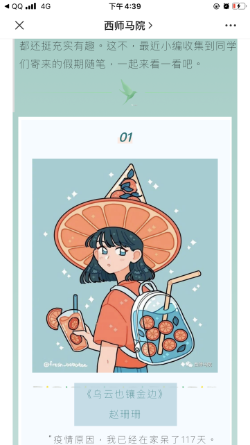 “疫情原因,我已经在家呆了117天。最开始时,认真打扫卫生,研究学习开发菜谱,做饭也充满未知数。宅在家里,感受到很长时间没有过的宁静。这段时间,陪伴家人一起做美食、刷剧、聊天、听外婆唱戏,做一个捧场的粉丝;静下心来看一些之前搁置的书籍;还有一些很不错的电影。每朵乌云都镶有金边,既然已经宅在家里了,为何不选择以最积极地态度面对它呢?”