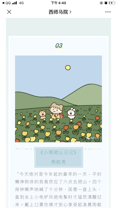 “今天绝对是今年起的最早的一天,平时懒神附体的我竟然应了六点去爬山。四个闹钟嘶声呐喊了十分钟,困意一直上头,直到坐上小电驴风驰电掣时才猛然清醒过来。戴上口罩仿佛才安心享受起凌晨雨歇后飘来的丝丝凉意。沿着林荫小道溜达踱步,绕过一个个岔路口,不知不觉就到了革命烈士纪念碑前。叽喳喳的嘴一时慢慢缄默,步伐渐渐沉重。来到一座直耸挺拔的石碑底下,仰头望去,八个铁画银钩的大字赫然跃入眼帘:革命烈士永垂不朽!每每立在这块丰碑之下总是心神振荡,胸中豪气干云,油然而生一股自豪之情:幸为故乡人,幸入华夏门!”