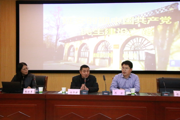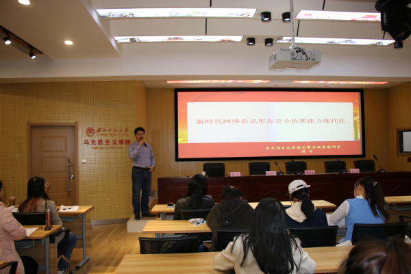 魏彩苹教授作了题为“延安时期中国共产党民生建设之路”的学术报告,系统讲解了延安时期取得的民生成效。从物质民生,教育民生,健康民生,文化民生,环境民生,社会民生六个方面展开论述,提出要在传承红色精神的同时,讲好民生故事,总结历史经验。谢平振副教授作了题为“思政教育者的马克思主义理论素养”的报告,提出新时代对人才质量和层次的要求提高,研究生要努力提升马克思主义理论素养,善于将感性个体存在向理性社会转化,把握理性驾驭感性的能力。周方副教授以“新时代网络意识形态安全治理能力现代化”为题作了报告,提出网络意识形态的核心是“价值观念”,从习近平关于意识形态安全的重要论述,网络意识形态治理面临的问题,网络意识形态治理的现状,网络意识形态治理能力现代化的途径四个方面,论述了维护意识形态安全的重要性。