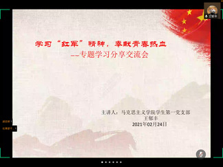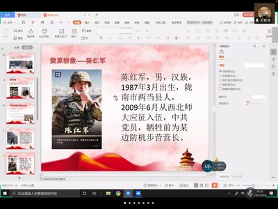 然后,主讲人王郁丰向大家讲述了加勒万河谷中印冲突的原因、陈红军烈士生前与妻子的约定和他与妻子温馨的家庭生活场面。在一本书中,陈红军烈士特意标注了一段话:“党把自己放在什么岗位上,就要在什么岗位上建功立业。”接着由参会人员华宇星等同学分享自身的感想,华宇星说:“陈红军烈士具有很强的家国情怀,让我们真正明白了,哪有什么岁月静好,只不过是有人替我们负重前行。”同为与会人员的郭越说:“陈红军烈士既是一个孩子,又是一个父亲,他的牺牲不仅为了自己,更是为了千千万万的人民,这种精神将永远激励着我们为祖国、为人民做出贡献。”最后,梁凯博老师做出会议总结,他说:“希望各位同学今后可以更加扎实的学习专业知识,做好自己的本职工作,牢固树立奉献意识,为以后走上更大的工作岗位做准备。并以‘红军’精神为引领,无论在什么事什么岗位上都发扬奉献精神。”