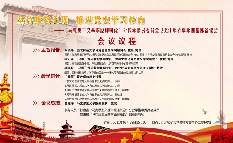 为深入贯彻落实习近平总书记在学校思想政治理论课教师座谈会上的重要讲话精神,根据中共甘肃省委教育工委《关于组织开展甘肃省大中小学思政课教师“同上一堂党史课”集体备课会的通知》,结合习近平总书记在党史学习教育动员大会上的讲话精神,由中共甘肃省委教育工委思政处、甘肃省“马克思主义基本原理概论”分教学指导委员会主办,新葡萄8883官网AMG教师发展中心、新葡萄8883官网AMG承办,于2021年3月29日15:00在新葡萄8883官网AMG教师发展中心二楼报告厅召开“坚持唯物史观,推进党史学习教育——‘马克思主义基本原理概论’分教学指导委员会2021年春季学期集体备课会”。