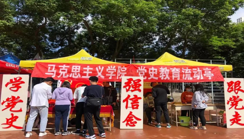 为深入开展丰富多样、独具特色的党史学习教育,在运动会期间,新葡萄8883官网AMG团委面向全体师生于西操场东南角设立党史学习教育读书流动亭。党员做先锋,团员紧跟随,引导广大青年学生读原文、学原著、悟原理,切实做到“学史明理、学史增信、学史崇德、学史力行”,推动党史学习教育走深走实、入脑入心。