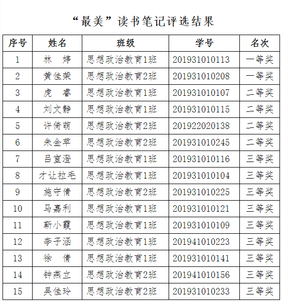 学院组织专业课教师组成评审小组对学生笔记进行评选,评选出了“最美”笔记一等奖2名、二等奖4名、三等奖9名。现将评选结果公布如下: