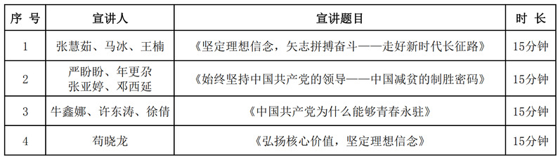本次宣讲团宣讲采用“菜单预约”模式。全校各单位可根据宣讲需求,自主选择并进行宣讲预约。相关内容及流程如下: