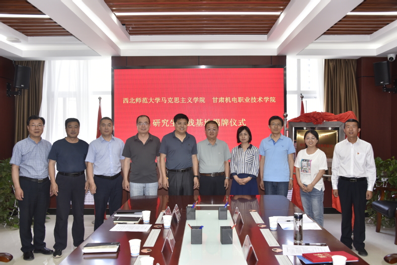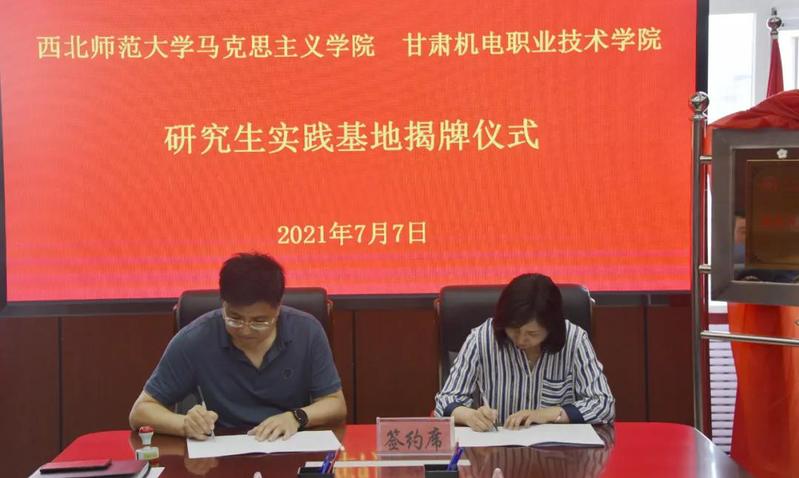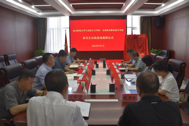 为做实做好马克思主义理论学科研究生教育实习和社会实践活动,提高研究生专业实践能力,融通资源,加强合作,2021年7月7日,新葡萄8883官网AMG副院长孙健、副院长金建萍、马克思主义理论学位点负责人侯选明、研究生秘书张莉一行前往甘肃机电职业技术学院举行了新葡萄8883官网AMG研究生培养实践教学基地签约挂牌仪式。甘肃机电职业技术学院党委副书记赵彦军院长、纪委书记李自勇、副院长张德龙、党委组织部部长毕明明、党委宣传部部长郭爱农、办公室主任谢旭斌、对外合作办主任赵典凯、新葡萄8883官网AMG副院长史维波等人参加了签约挂牌仪式。