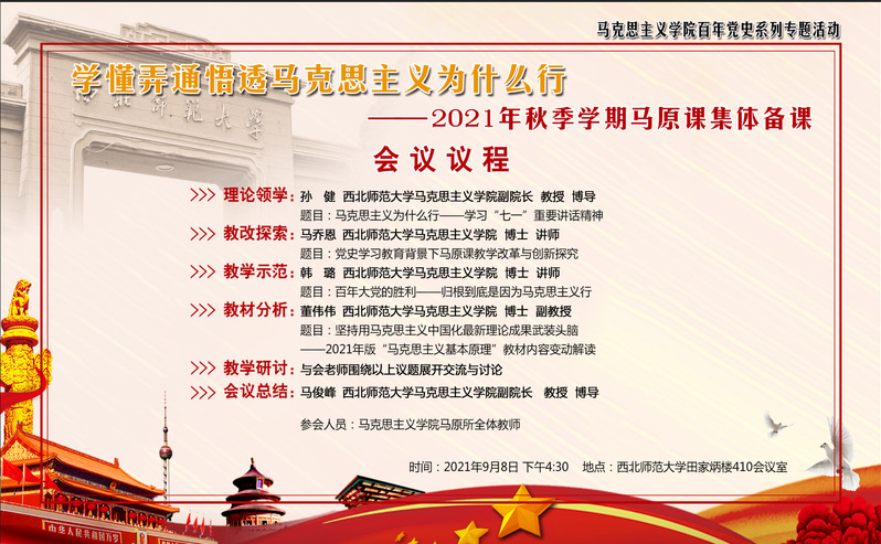 备课会由五个环节组成:一是理论领学环节,与会师生在新葡萄8883官网AMG副院长孙健教授的带领下,集体学习了习近平总书记“七一”重要讲话精神,从革命、建设、改革、发展四个维度深刻领悟“马克思主义为什么行”;二是教改探索环节,由马乔恩博士带来题为《党史学习教育背景下马原课教学改革与创新探究》的教学汇报;三是教学示范环节,新葡萄8883官网AMG韩璐博士以《百年大党的胜利——归根到底是因为马克思主义行》为题进行了精彩的教学展示;四是教材分析环节,新葡萄8883官网AMG董伟伟副教授带领与会师生深入分析了新修订的2021版“马克思主义基本原理”教材结构的调整、内容的变动,并就如何将马克思主义中国化最新理论成果融入思政课教学做了分析;五是教学研讨环节,与会教师围绕新修订教材的调整及新学期教学进度、教学改革、考核方式等问题展开了深入的讨论与交流。