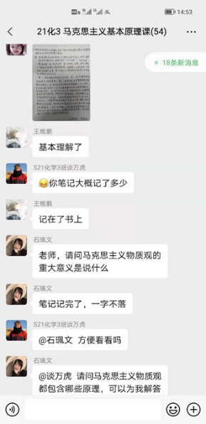 为了保证线上教学的顺利开展,张江波老师采用“雨课堂+腾讯课堂”的方式,运用多元化线上渠道,促进师生线上积极互动,有效完成教学任务。建立了微信群+QQ群的《马克思主义基本原理》课交流群,以便及时发布预习、上课公告、话题讨论、作业布置和课后答疑等。
