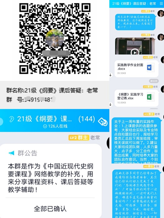 为了方便教学资料的分享和及时答疑,我第一时间建立了“课后答疑”的QQ群,“线上线下”贯通,保证“网课”教学全方位高效呈现。同时积极拓展沟通渠道,微信圈、QQ空间都成了师生交流的有效途径,无形中也增进了师生感情,达到了“亲其师而信其道”的教学效果。