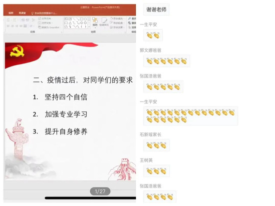王宏渊副书记感谢各位家长能和学院同心同向同行,为孩子的成长保驾护航。希望家长继续配合学校,做好学生疫情防控常态化工作;持续关注、关心学生的身心健康状况和动态轨迹;引导学生做好职业生涯规划和学业工作。希望同学们通过这次以“固化防疫知识、弘扬抗疫精神”为主题的“复学第一课”,尽快恢复积极的学习生活状态,严格遵守校纪校规,做有责任、有担当,懂感恩、乐奉献的新时代马院人。