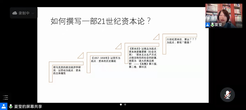 夏莹教授以如何撰写一部21世纪的《资本论》为切入点,首先提出在金融资本占据主导的今天,撰写一部新时代的《资本论》是历史和现实的双重需要。其次,夏莹教授从经济和哲学两个维度出发,为我们解读了马克思关于资本本质的界定问题,指出马克思研究资本的核心在于社会关系或者经济权力的建构。再次,以资本和历史的前提为基础,分析了以货币为起点的资本逻辑,强调货币本身的哲学韵味,表达了资本主义社会内部架构的基础矛盾,成为马克思经济思想不断演进的一个基础要点。最后,夏莹教授从商品和资本的逻辑入手,分析了货币(金融)资本逻辑下的资本增殖和简单商品逻辑的资本增殖问题,提出“当我们进入到货币资本的流转、以货币作为中介化的实体不断虚化的今天,货币增殖的逻辑有没有可能在流通领域”这一问题供大家思考。