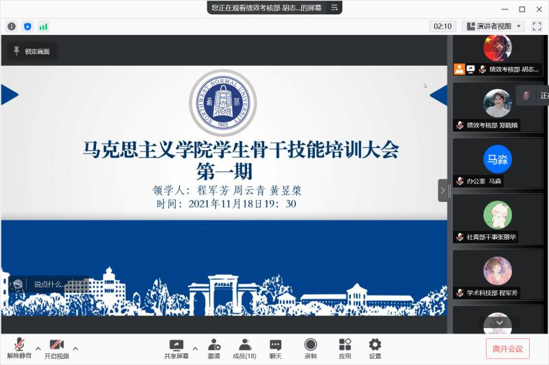 11月18日晚上7:30,新葡萄8883官网AMG学生骨干培训班顺利开班,本次培训班以线上的方式举行。培训由新葡萄8883官网AMG青马工作室同学马嘉利、学生会学术科技部负责同学程军芳、体育部负责同学周云青、“四自”委员会负责同学黄昱棨担任领学。学院团委梁凯博老师参加开班式。