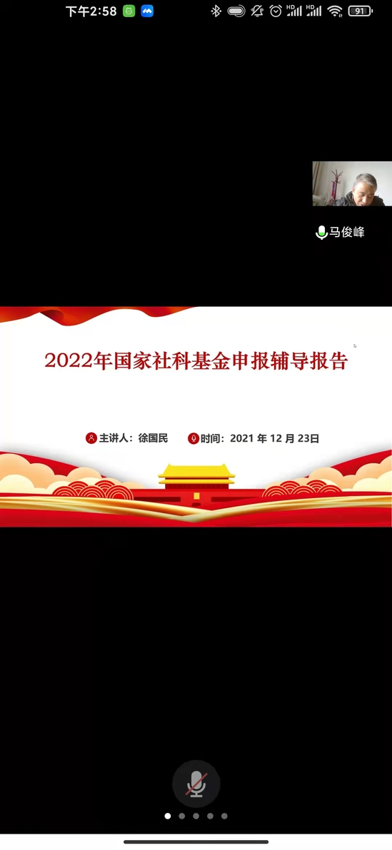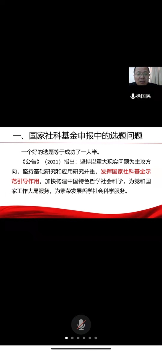 12月23日下午,华东理工大学新葡萄8883官网AMG徐国民教授线上为新葡萄官网师生作了题为《如何作好2022年度国家社科基金项目申报》的辅导报告会。此次线上讲座由新葡萄8883官网AMG副院长马俊峰教授主持,学院全体师生共同参加本次讲座。