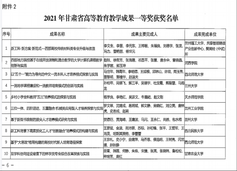 近日,省人社厅、省教育厅印发《关于表彰2021年甘肃省高等教育教学成果奖的决定》(甘人社厅发〔2021〕29号),西北师大喜获2021年甘肃省高等教育省级教学成果奖特等奖3项,一等奖6项,二等奖6项。新葡萄官网教师王宗礼、史小宁、金建萍、马乔恩、侯选明、王树亮、闪兰靖、赵秋静喜获2021年甘肃省高等教育教学成果奖一等奖。