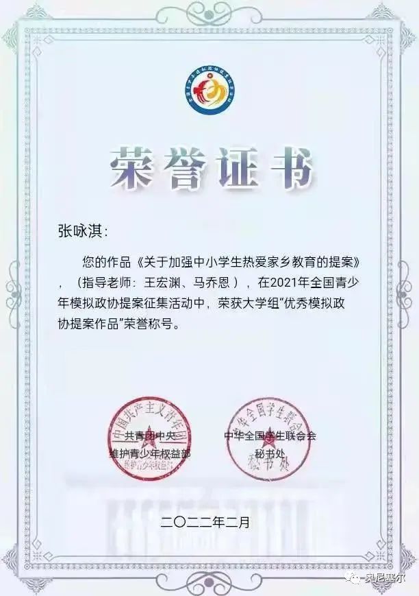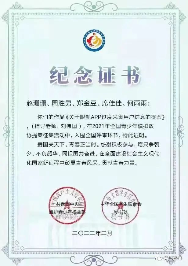 由新葡萄官网新葡萄8883官网AMG学生张咏淇负责,新葡萄8883官网AMG王宏渊、马乔恩老师指导的提案作品《关于加强中小学生热爱家乡教育的提案》在全国评审中脱颖而出,获评大学组“优秀模拟政协提案作品”荣誉称号。同时,由新葡萄8883官网AMG学生赵珊珊负责,新葡萄8883官网AMG学生周胜男、生命科学学院学生席佳佳、外国语学院学生何雨雨、心理学院学生郑金豆共同参与的提案作品《关于限制APP过度采集用户信息的提案》入围全国评审环节。