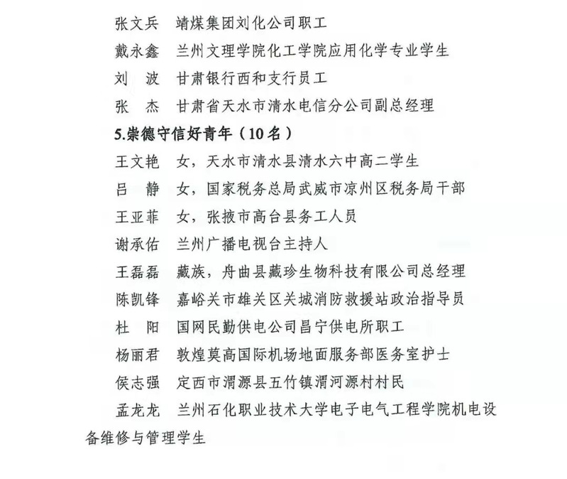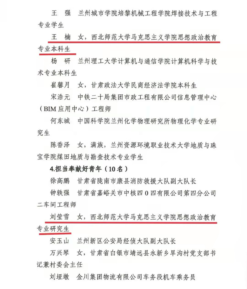 近日,在共青团甘肃省委2022年“甘肃省向上向善好青年”评选活动中,我院硕士研究生刘莹雪,本科生王楠分别获得“担当奉献好青年”和“勤学上进好青年”荣誉称号。