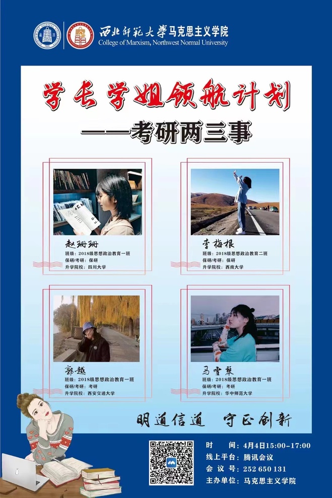 2019级思想政治教育1班牛鑫娜同学认为,在此次学长学姐领航活动中,我首先感受到的是马院学子脚踏实地的学风,无论是选择保研还是考研,学姐们都对自己的未来有着清晰的规划和定位,并为之不断努力,这种孜孜不倦、一直向前的精神状态让我备受鼓舞。其次是学姐们毫无保留的分享让我们明白现阶段要做什么、能做什么,她们宝贵的经验使我们在备考的路上少走了许多弯路。这场活动犹如一场及时雨,缓解了我们的焦虑,冲散了我们的迷茫,使我们脚下的路走得更坚定,更有力!