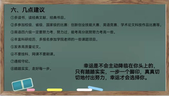 2020级思想政治教育2班石辛炜同学指出,本次经验分享给了我充足的动力和鼓励,以下是我的收获总结:学业上,目前是大二第二学期,有较为充足的时间和精力去备考,提前去了解相关专业及院校的报考信息,做好专业课的认真学习和英语的平时积累(英语口语的重要性);生活上,多参与社会实践活动丰富自身,培养较为良好的行为习惯,大学里不会有人来监督你,只能凭自律能力,因此自我心态调节也极为重要。最后借李梅根学姐的话来与大家共勉——“幸运是不会主动降临在你头上的,只有踏踏实实,一步一个脚印,真真切切地付出努力,幸运才会选择你。”