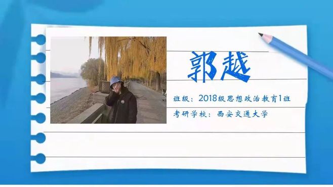 2018级思想政治教育1班郭越同学结合个人备考过程,系统介绍了考研择校的备考经验,同时重点强调了相关备考误区。郭越同学针对当前考研形势竞争激烈的客观现状,建议考研学生应慎重选择报考院校、合理安排复习进度、注重个人心态调适。