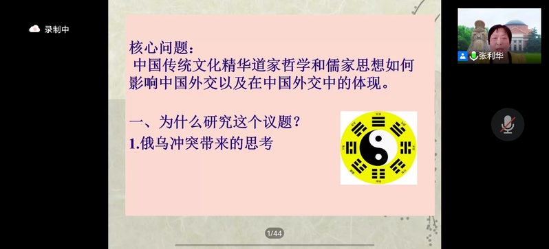 张利华教授的讲座围绕中国传统文化中的道家哲学和儒家思想如何影响中国外交及在中国外交实践中的体现。张教授以俄乌冲突为切入点,讲解了中国传统和谐哲学中的世界观、方法论以及价值观。其次,张教授分别阐释了太极哲学基本原理、阴阳辩证法、和谐价值体系的内容及其在中国外交中的体现,总结出中国特色大国外交的四个特征。最后,张教授对中美外交哲学进行了比较分析。