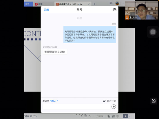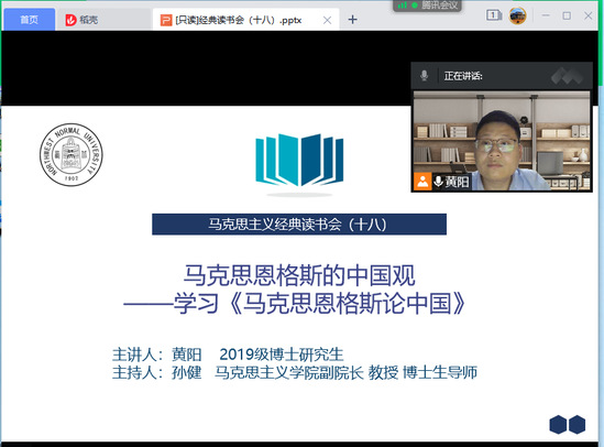 4月21日晚,第十八期马克思主义经典读书会在腾讯会议线上举行。2019级博士研究生黄阳以“马克思恩格斯的中国观”为题,对《马克思恩格斯论中国》中马克思恩格斯的中国观作了解读。学院副院长、博士生导师孙健教授主持读书会,60余名博士硕士研究生参加。