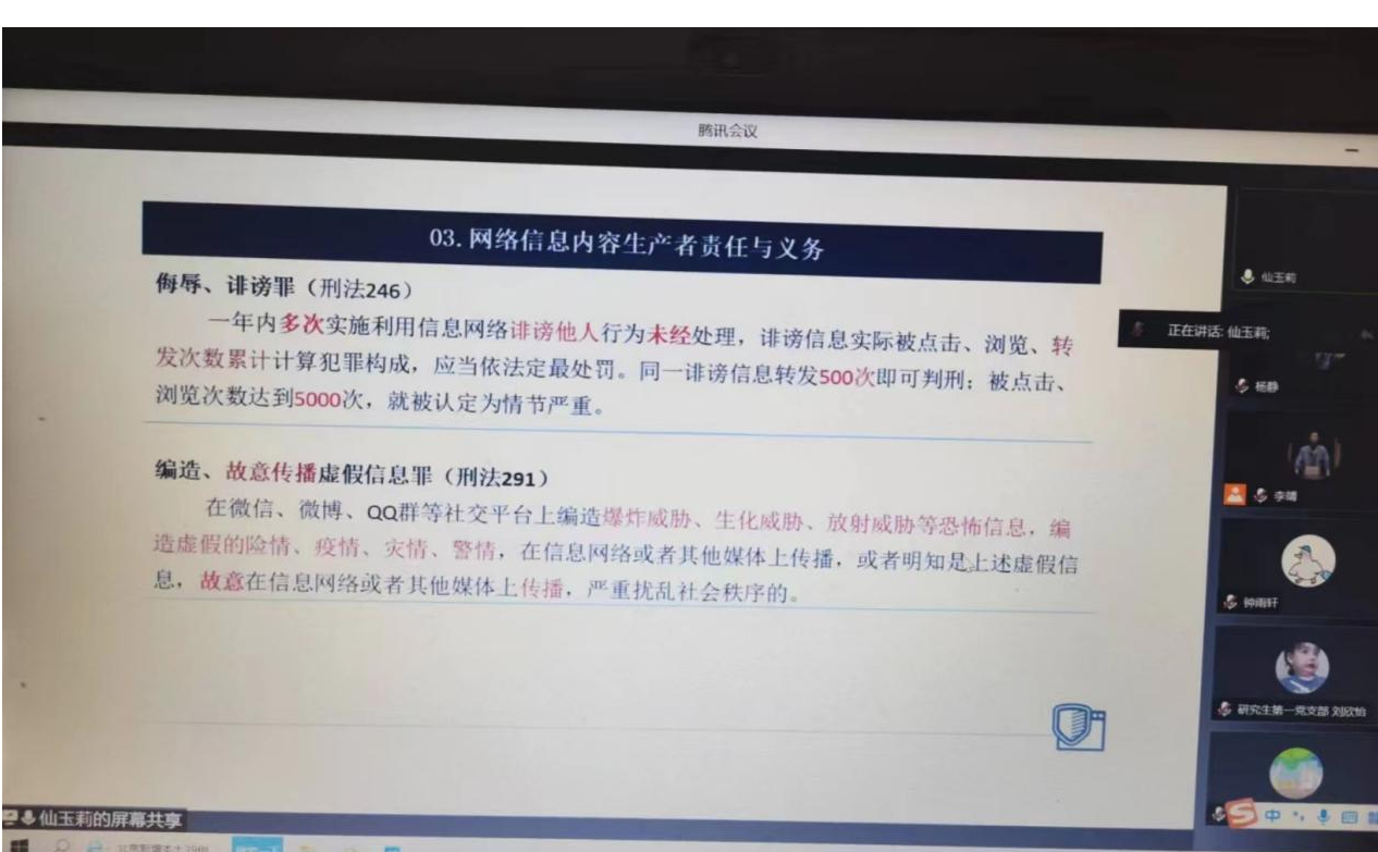 筑网络安全防线,人人有责。专题学习会上,学院仙玉莉老师领学了习近平关于网络意识形态安全的重要论述;结合实际案例,详细解读了《中华人民共和国网络安全法》《中华人民共和国数据安全法》《网络信息内容生态管理规定》等网络治理法律法规,明确了网络服务提供者、网络信息生产者、使用者的义务与责任,并对如何做好新时代网络意识形态安全防范与应对提出了应对策略。