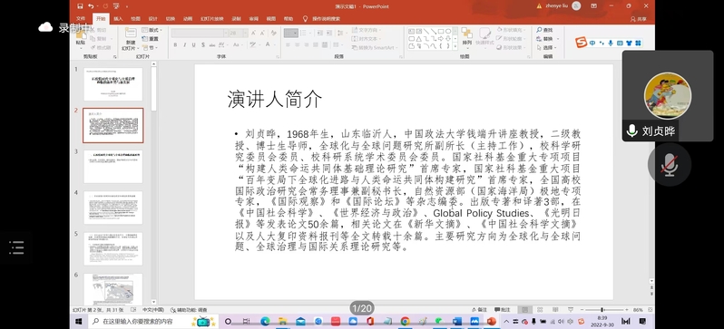 9月30日上午,应新葡萄8883官网AMG邀请,中国政法大学刘贞晔教授线上为新葡萄官网师生作了题为《后疫情时代全球化与全球治理面临的新形势与新发展》的学术讲座,此次讲座由新葡萄8883官网AMG曹亚斌教授主持。