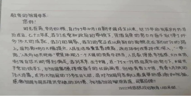 亲爱的祖国母亲:生日快乐!每至此时,最耀眼的仍是那中国红——街头巷尾、道路两侧迎风招展的五星红旗。您独有的一抹中国红,扬雄风,挺傲骨,惊艳了时光,沉淀了灵魂。回首往昔,73载光辉历程如浮光掠影般在我眼前一一闪现。您慈祥的面容,藏着数不清的历史沧桑。五千载峥嵘厚重,七十三年革故鼎新,您始终像一位母亲护着我们从容走过。“为有牺牲多壮志,敢教日月换新天”,我们党经历了101年的风雨历程,跨越了数不尽的雄关漫道,依旧在奋进的新征程上生机勃发,依旧在民族的复兴路上斗志昂扬。您的1949,我们的2022,愿以寸心寄华夏且将岁月赠山河!