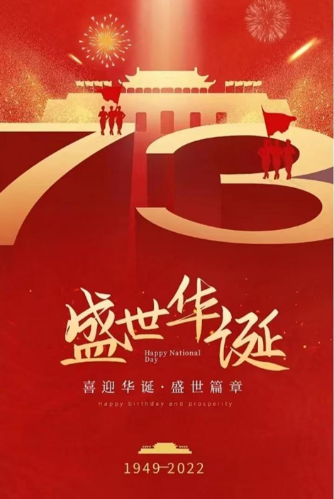 正值秋风送爽、硕果累累的十月,我们迎来了祖国母亲的生日。锦绣中华,盛世华章,国之大庆,与有荣焉……是初心与使命召唤的1949,是梦想与希望播撒的2022。这一路历经千磨万击,但仍芳华自在;这一路人民有信仰、国家有力量、民族有希望;这一路我们大步迈向富强民主文明和谐美丽的新时代。今朝生于华夏,与国同庆,倍感荣幸。作为新时代的新青年,欣逢盛世定当不负盛世,要毅然接过时代的接力棒,向着红旗指引的方向,以实干笃定前行,以奋斗谱写青春篇章,以梦想开启未来征程。在此,我们衷心的祝福祖国母亲生日快乐,永远繁荣、昌盛!