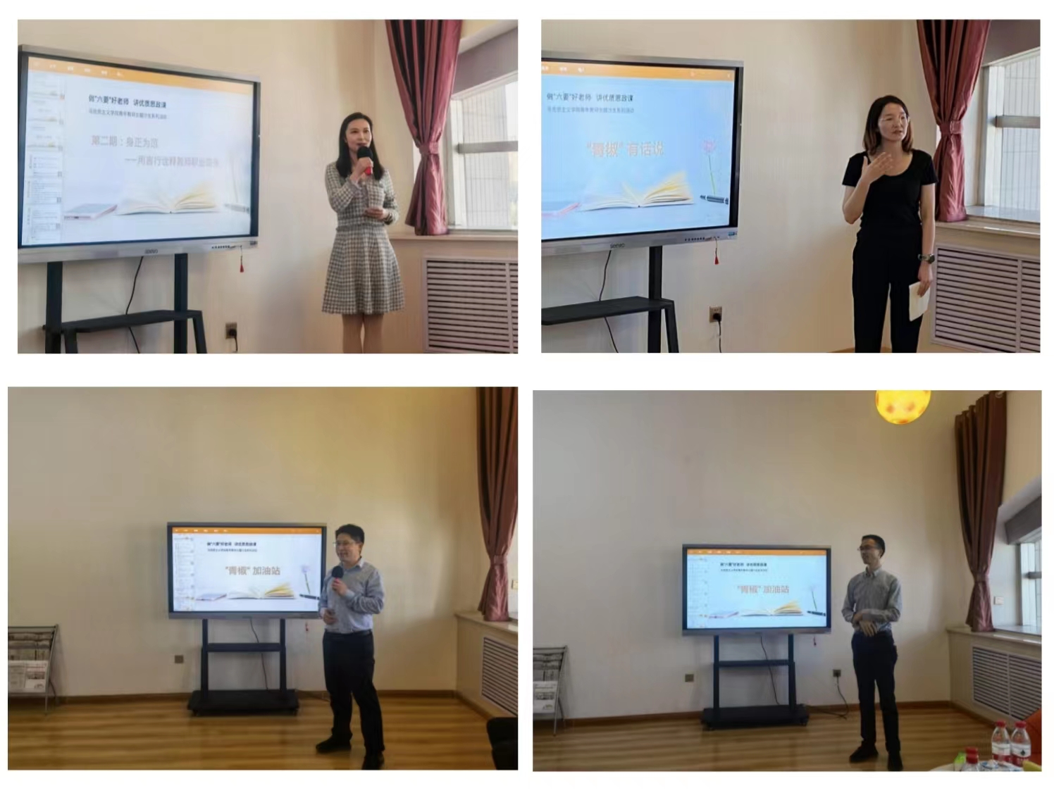 活动伊始,四位青年教师结合自己的教学实践和在师大期间的求学经历,分别从教师与学生的视角诠释了教师职业道德的标准以及发生在师大师德师风等的事例作交流分享。他们谈到,身为一名教师,要秉持“学高为师,身正为范”的理念,厚植教育情怀,加强实践淬炼,将更好的课堂带给祖国的下一代。思政课教师是守正创新的开拓者,也是立德树人的主力军,为广大青年筑梦引路、为教育事业尽心竭力、为党和国家培根铸魂是我们所肩负的职责使命。最后,四位青年教师呼吁我们要用知识与情怀砥砺育人初心,以强烈的时代使命感和担当精神创造崭新的成就,以有信仰,有情怀,有本领的积极姿态投身于中华民族伟大复兴的历史洪流。